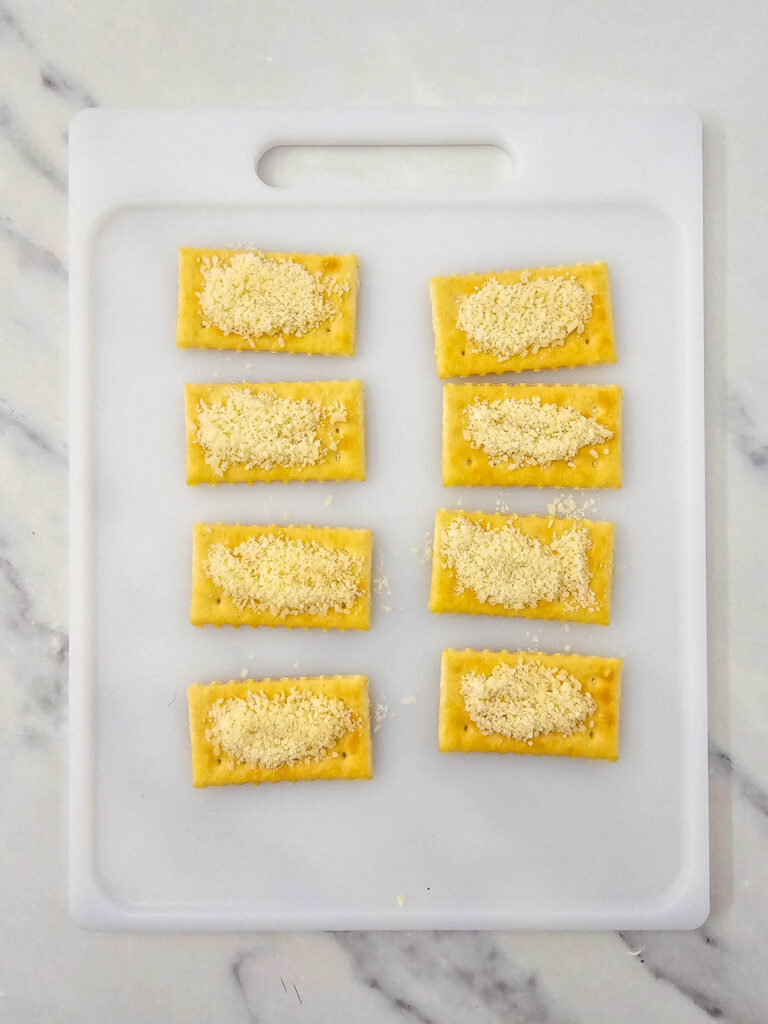 - Line the crackers up on a cutting board or tray. Top each of the crackers with some of the parmesan cheese.