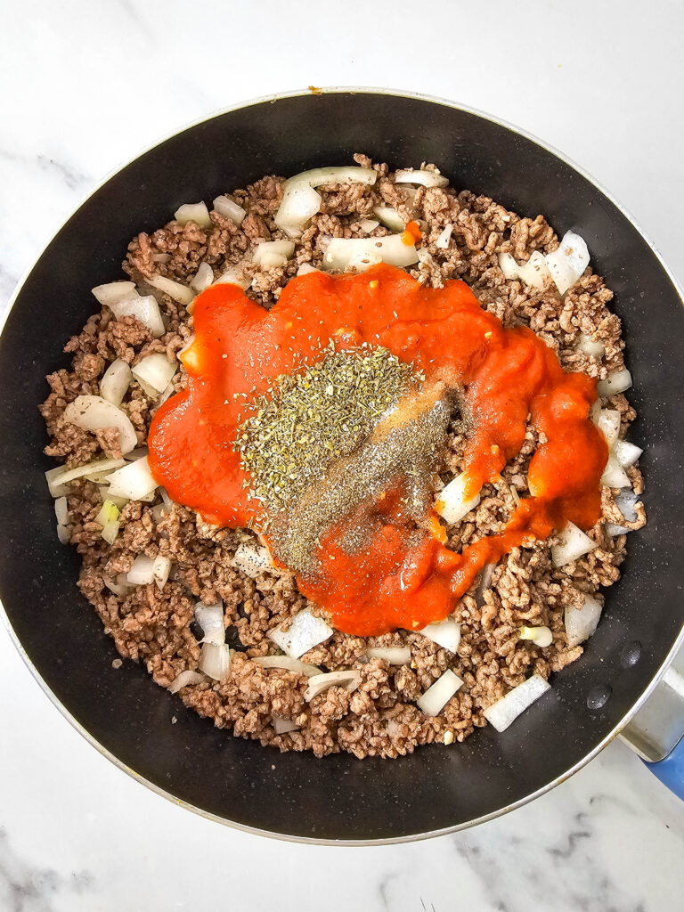 4. Add the onion and garlic, and continue cooking for about a minute. Stir the sauce and seasonings into the meat mixture. Set aside.