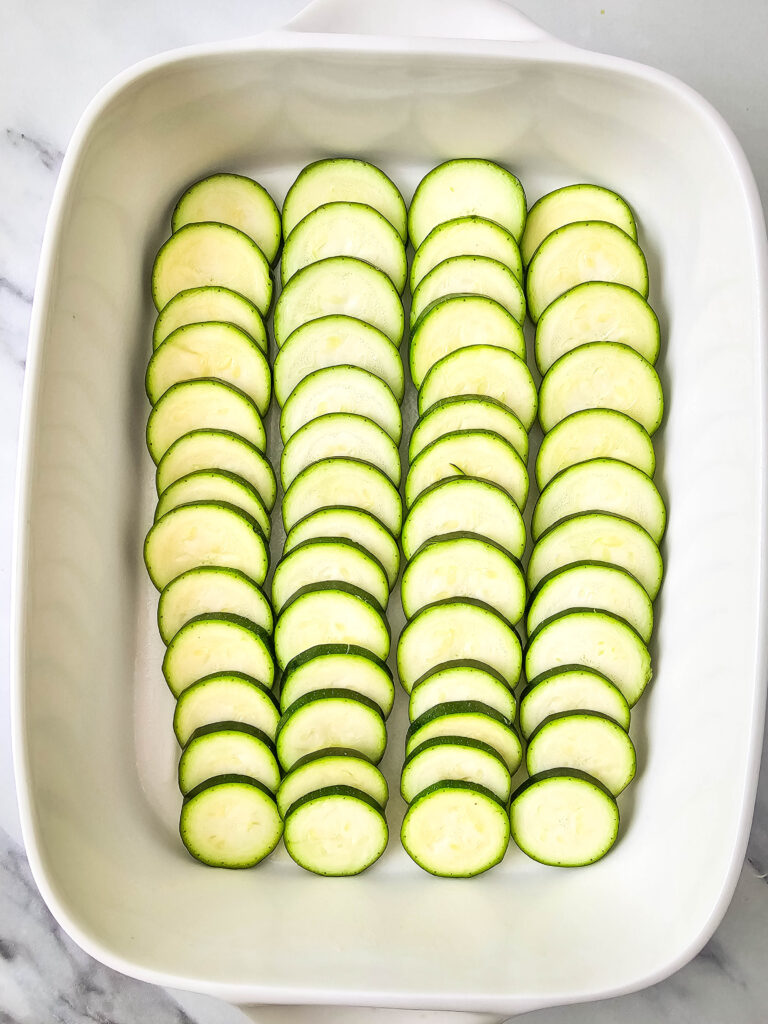 - Arrange the zucchini slices in rows in a 9x13-inch casserole dish, slightly overlapping each other.