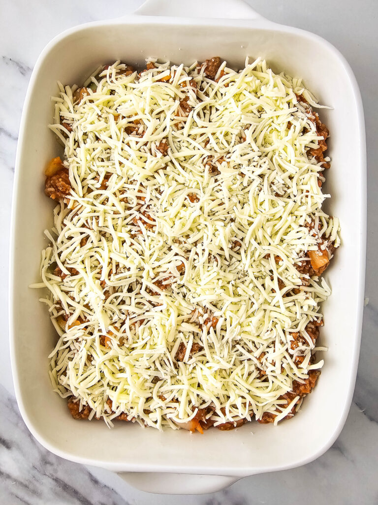 6. Pour the meat and sauce over the zucchini, then sprinkle with mozzarella.