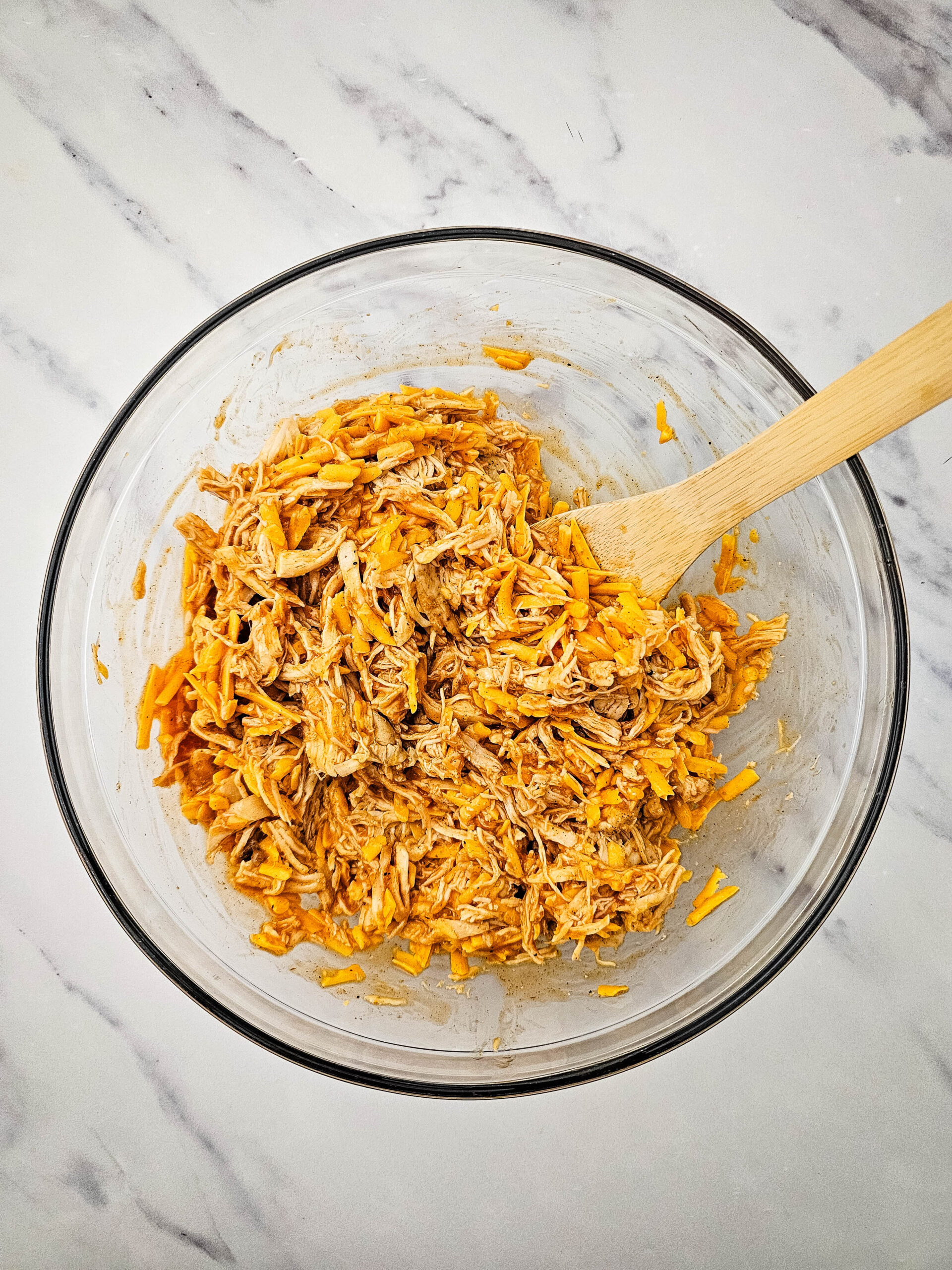 3. Add the chicken, half of the cheese, and half of the sauce to a large bowl and stir to combine.