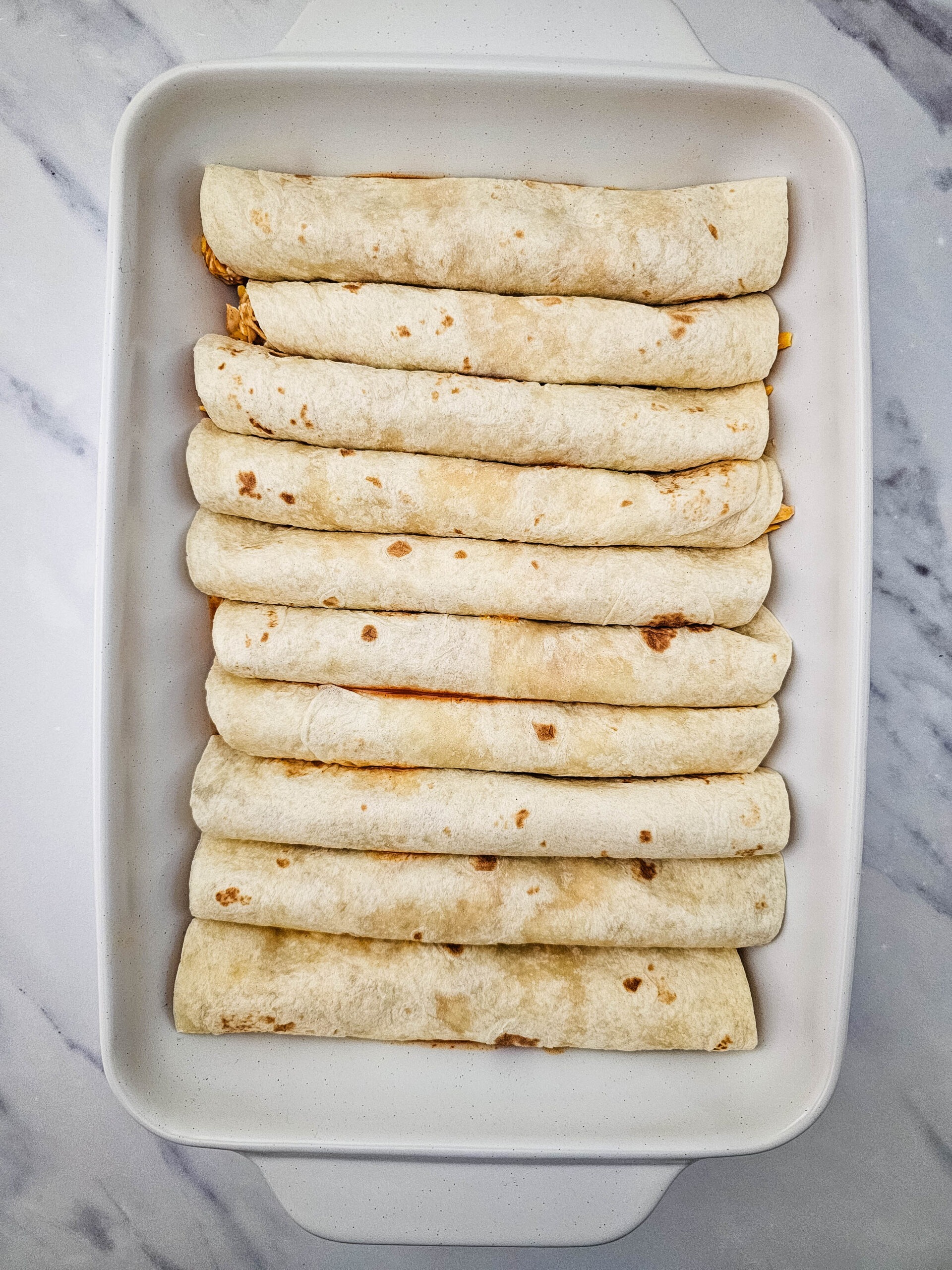- Spread a heaping spoonful across one edge of a tortilla, roll into itself. Place into the prepared casserole dish. Repeat until all of the tortillas have been filled. Squish the tortilla rolls into the dish as needed as it gets more full.