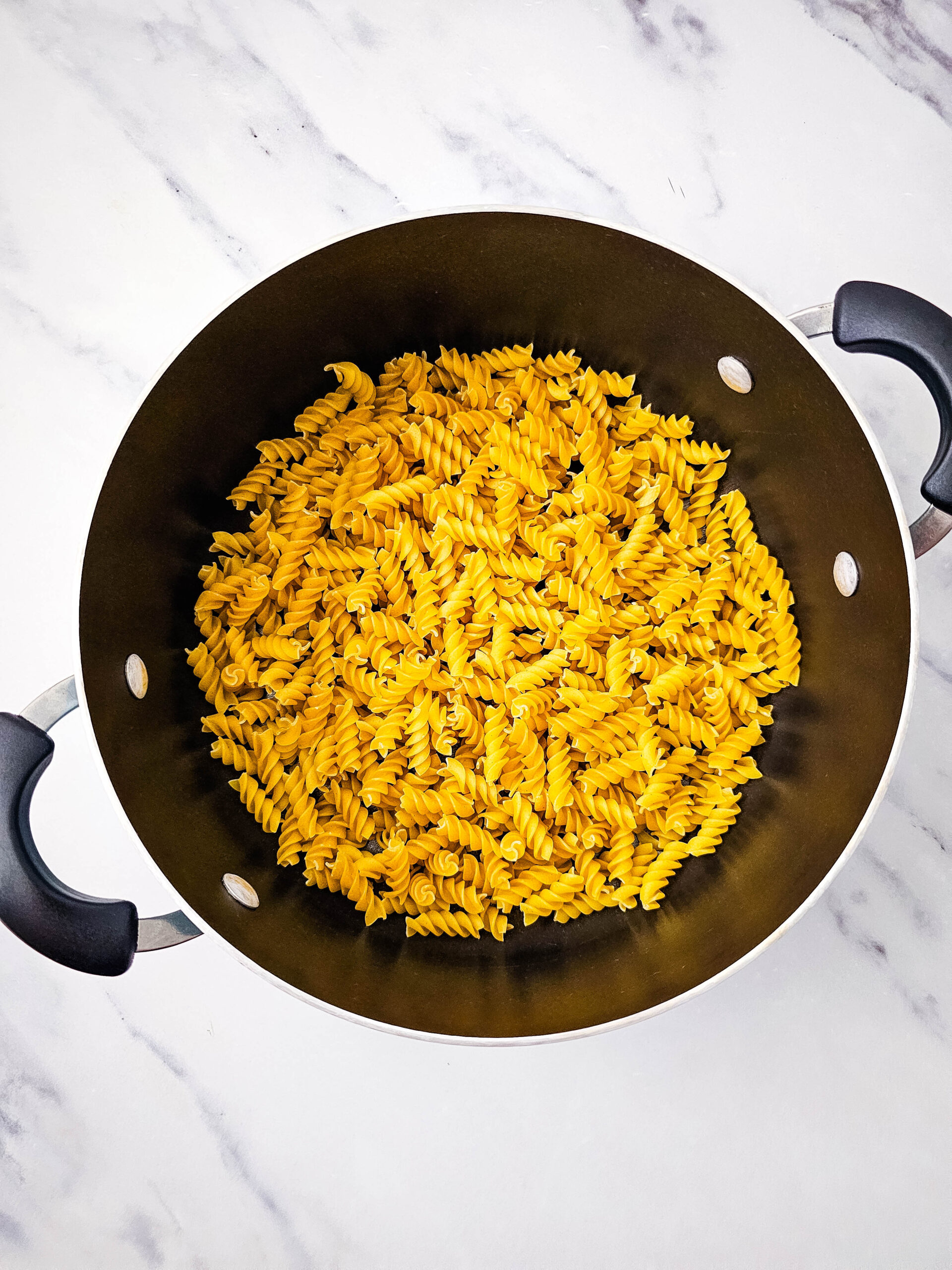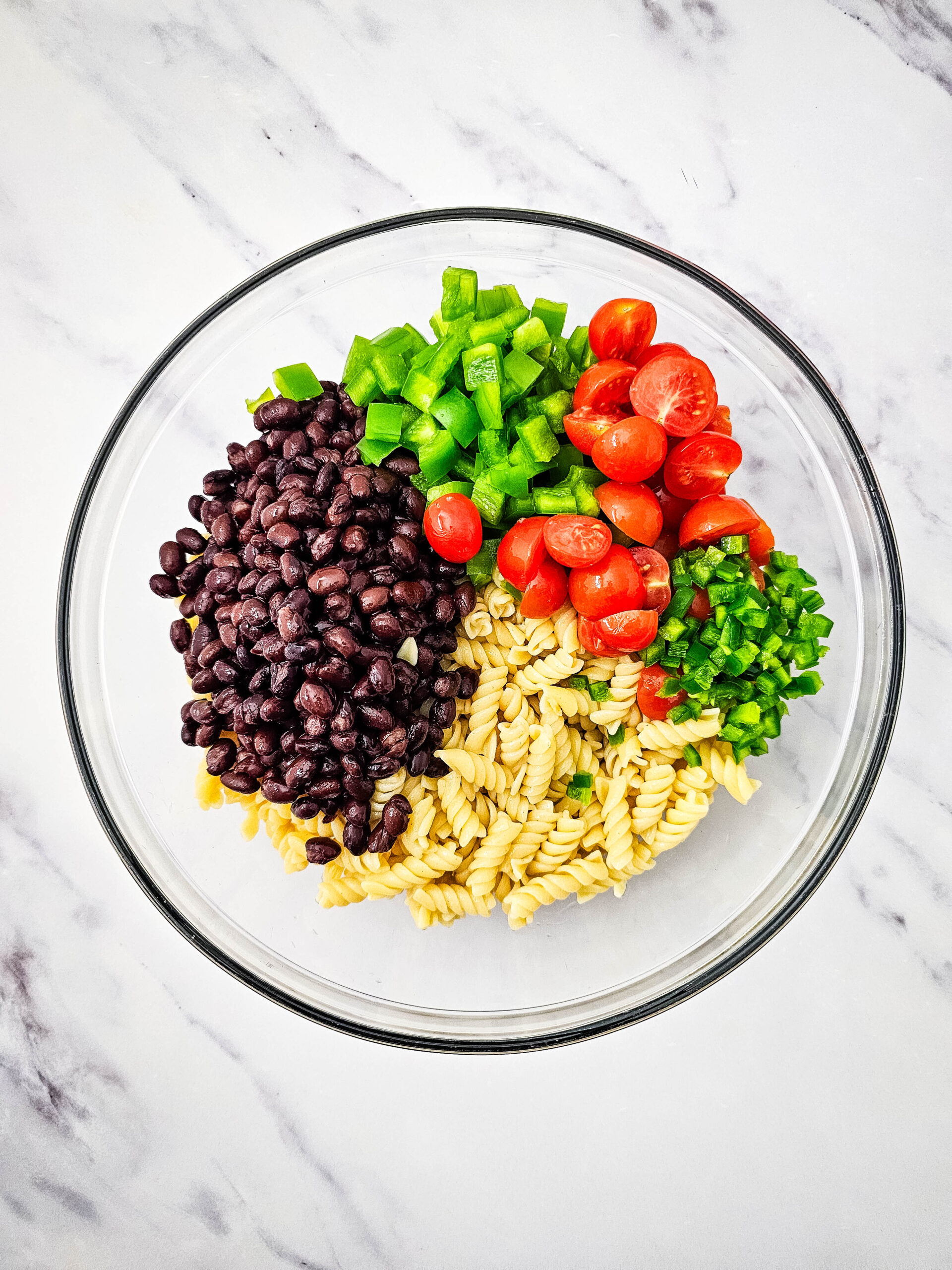 3. Add the cooled pasta and chopped veggies to a large bowl and toss to combine.