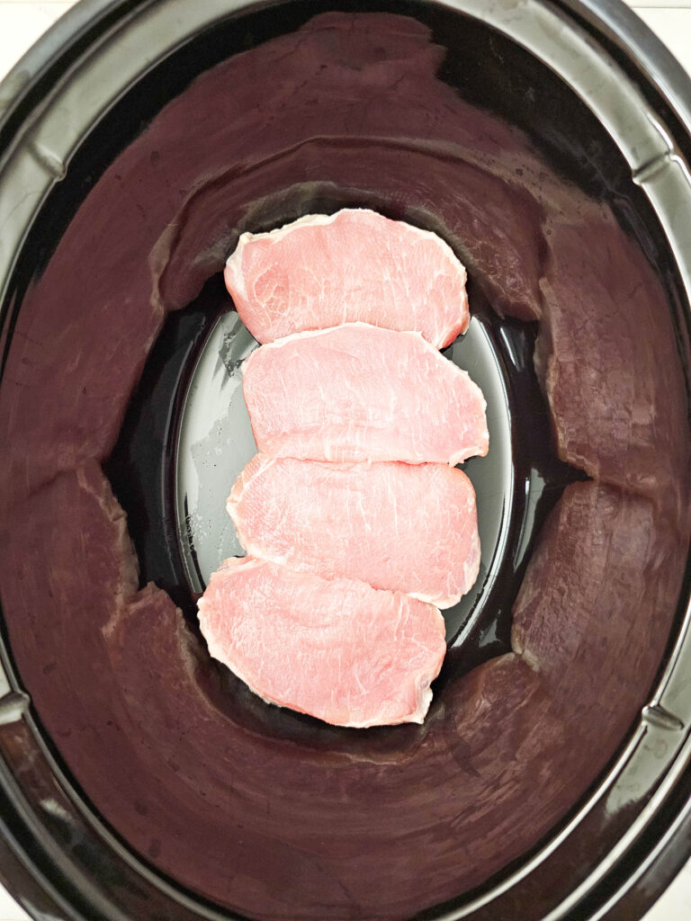 1. Add the pork chops to the bottom of the crockpot.