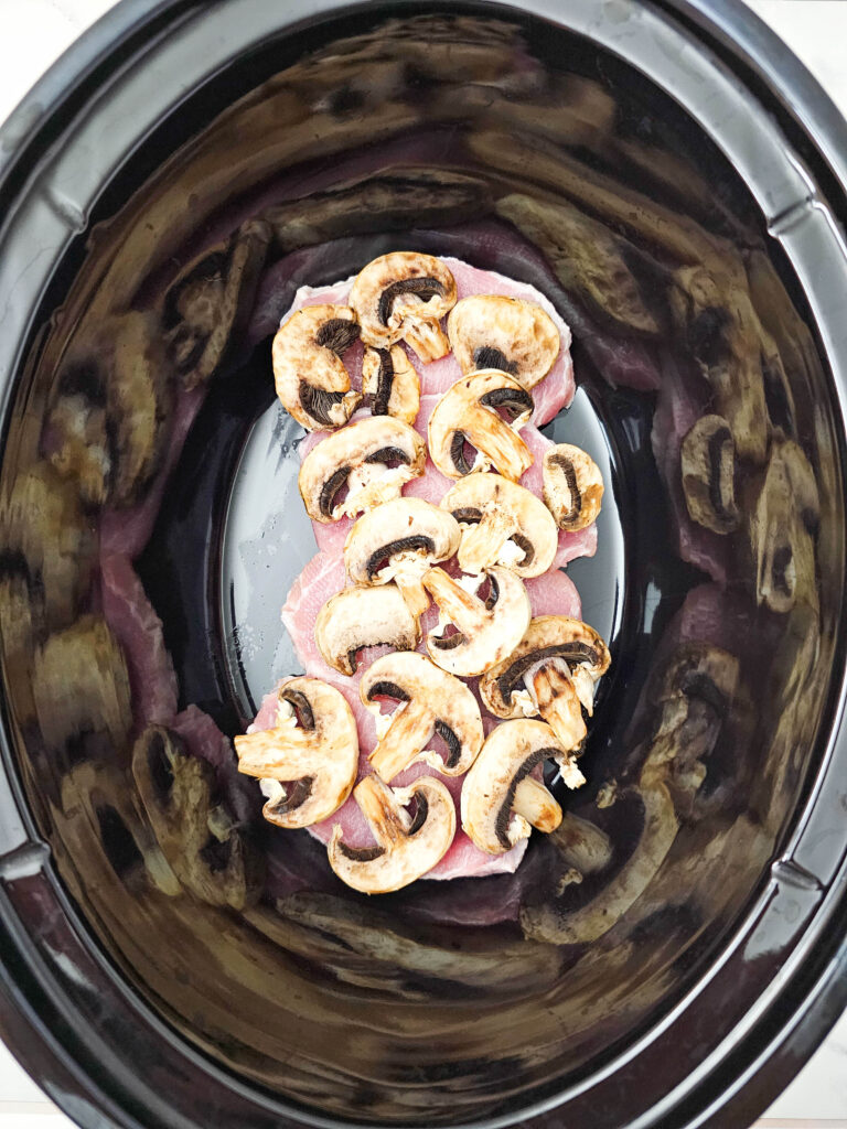 - Add the pork chops to the bottom of the crockpot.