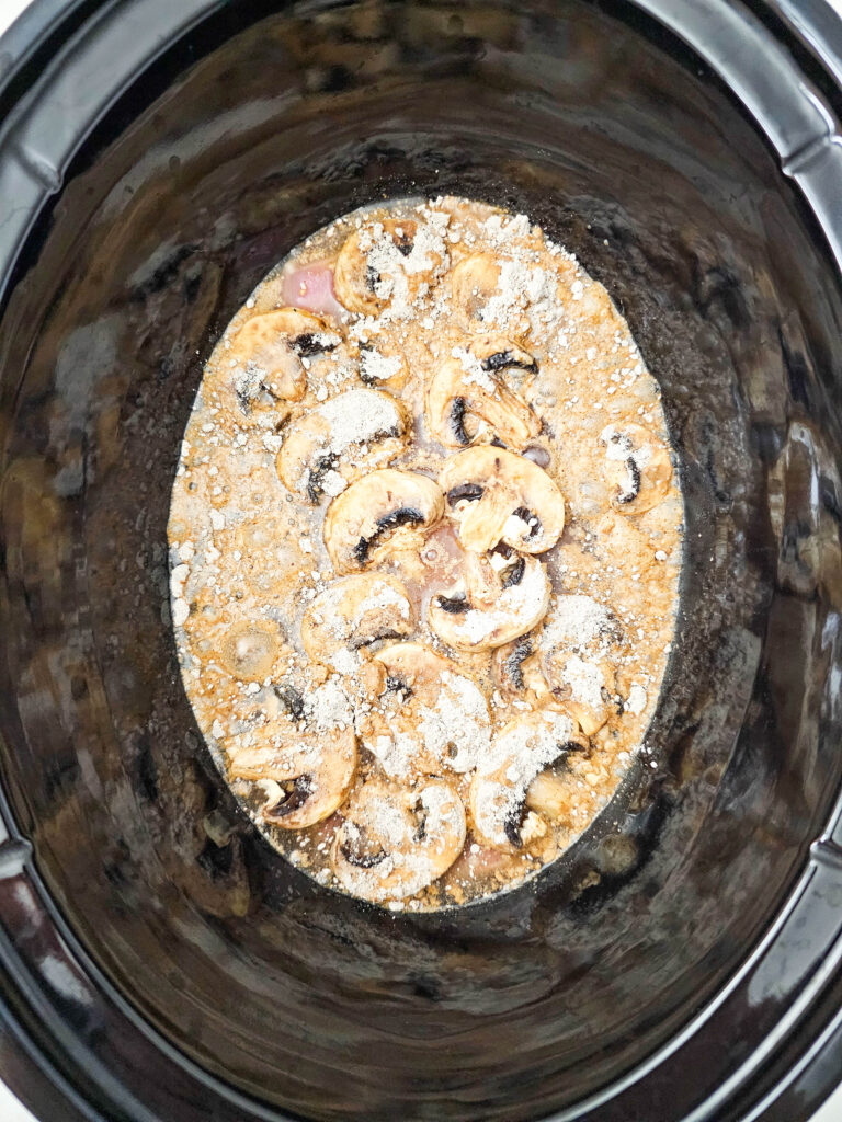 - Sprinkle the brown gravy mix over the mushrooms, then pour in the water.