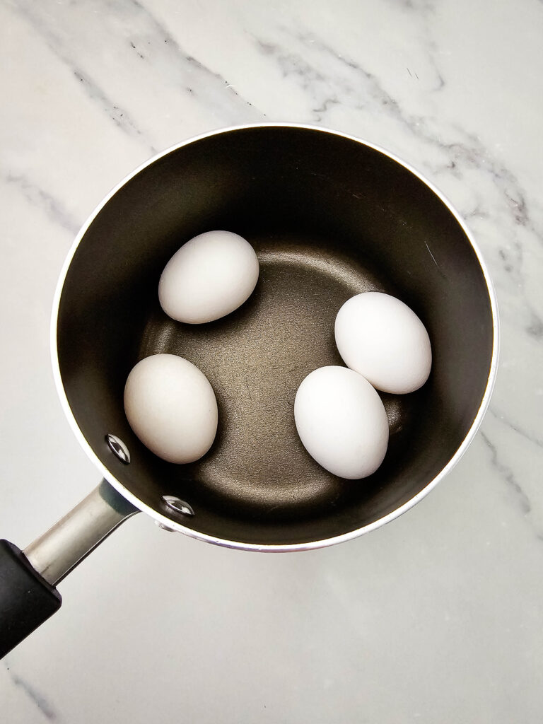 1. Add the eggs to a medium pot filled halfway with water, and bring to a boil. Continue boiling for 10 minutes. Turn the heat off and put the lid on the pot for 10 minutes.