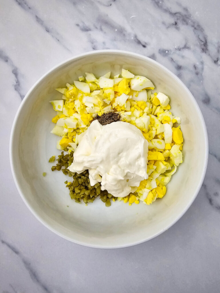 4. Mix the eggs, pickles, mayonnaise and pepper in a small bowl.