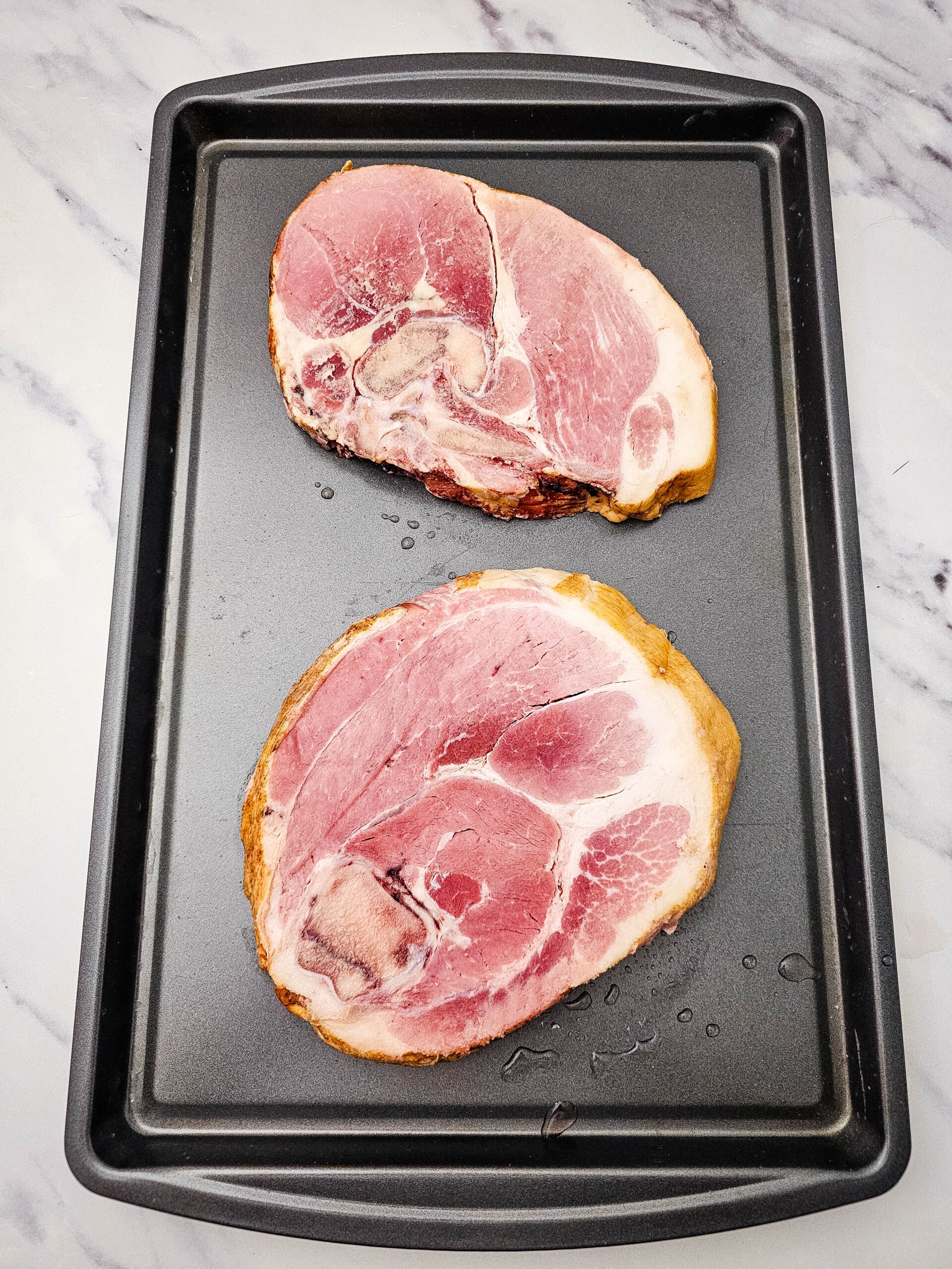 2. Arrange the ham steaks towards the center of the baking sheet.