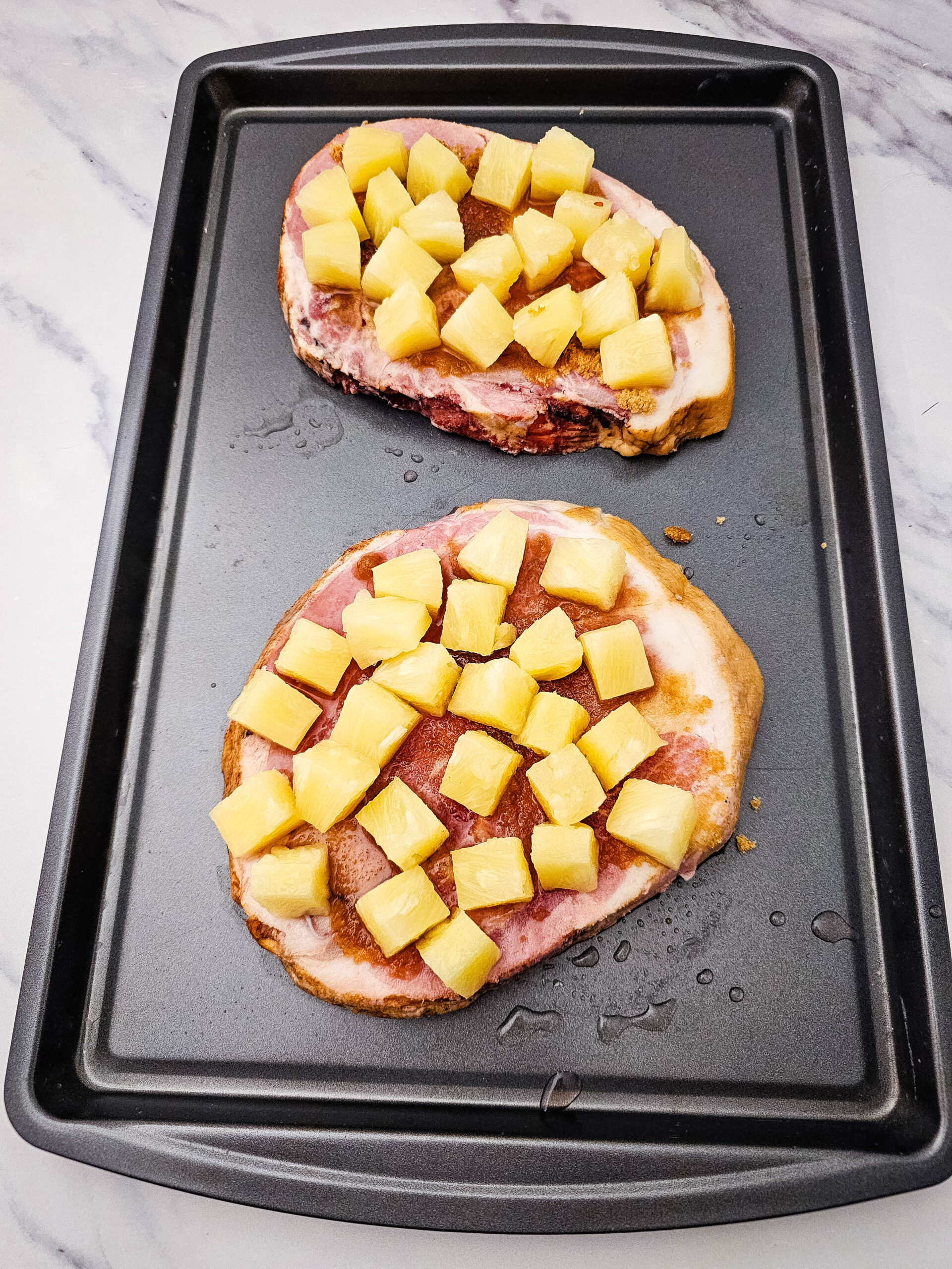 - Sprinkle the ham steaks with brown sugar, gently press it into the ham. Add pineapple chunks on top of the ham steaks.