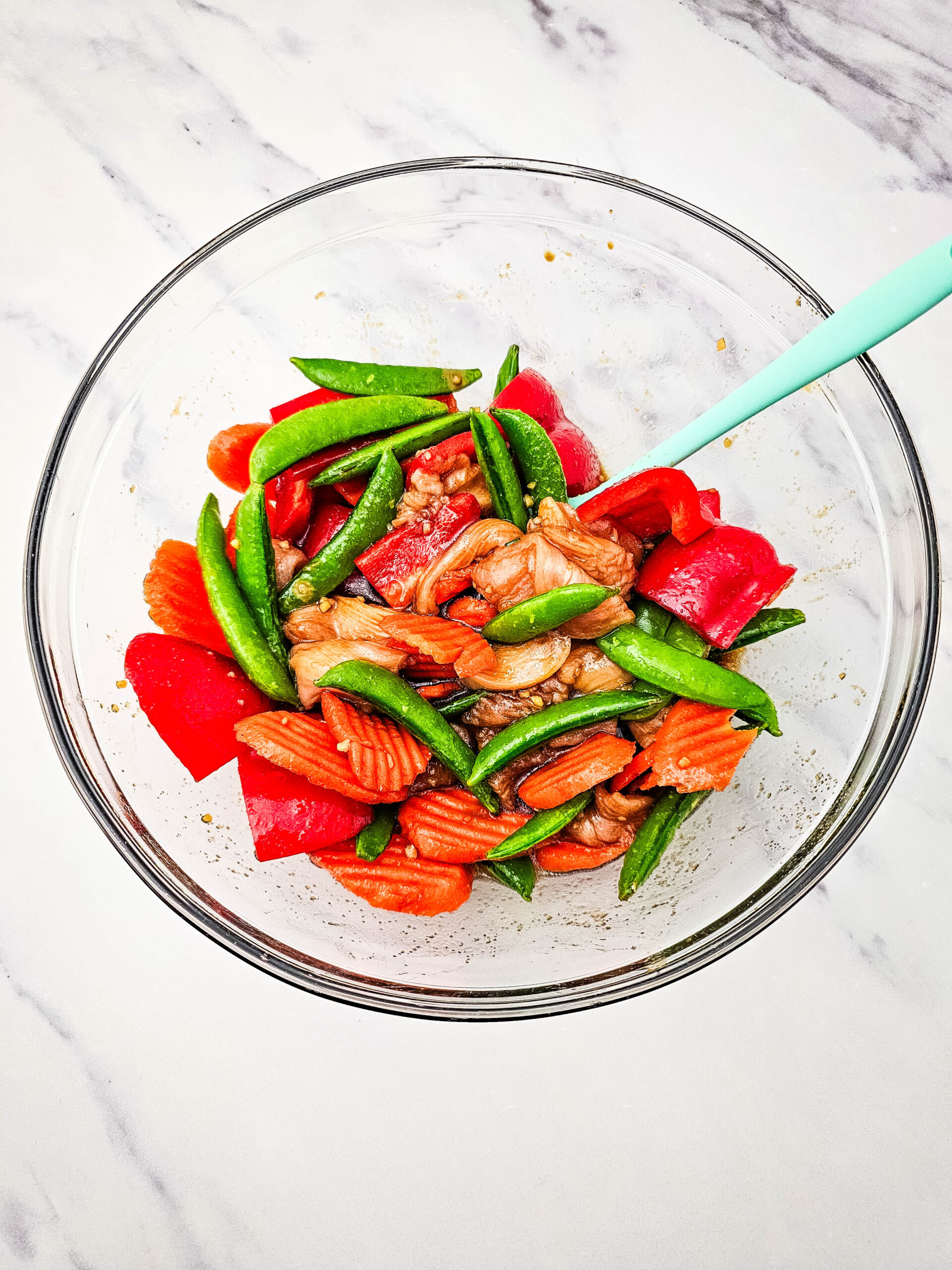 3. In a large bowl, whisk together the soy sauce, olive oil, honey, and seasonings, then add the chicken, peas, carrots, and red pepper. Toss to combine.