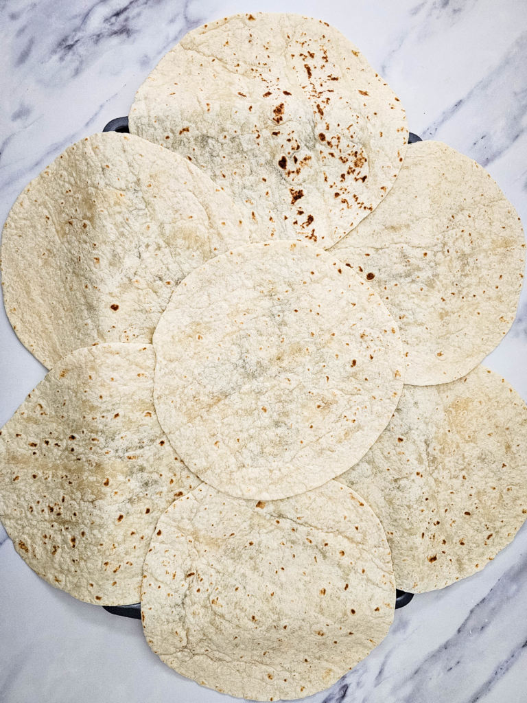 6. Arrange flour tortillas on a large sheet pan – each tortilla will be half on the pan, half off, and slightly overlapping. For a large sheet pan, you’d put two along each long side, then one at the top of the pan, one at the bottom. Then add one to the center.
