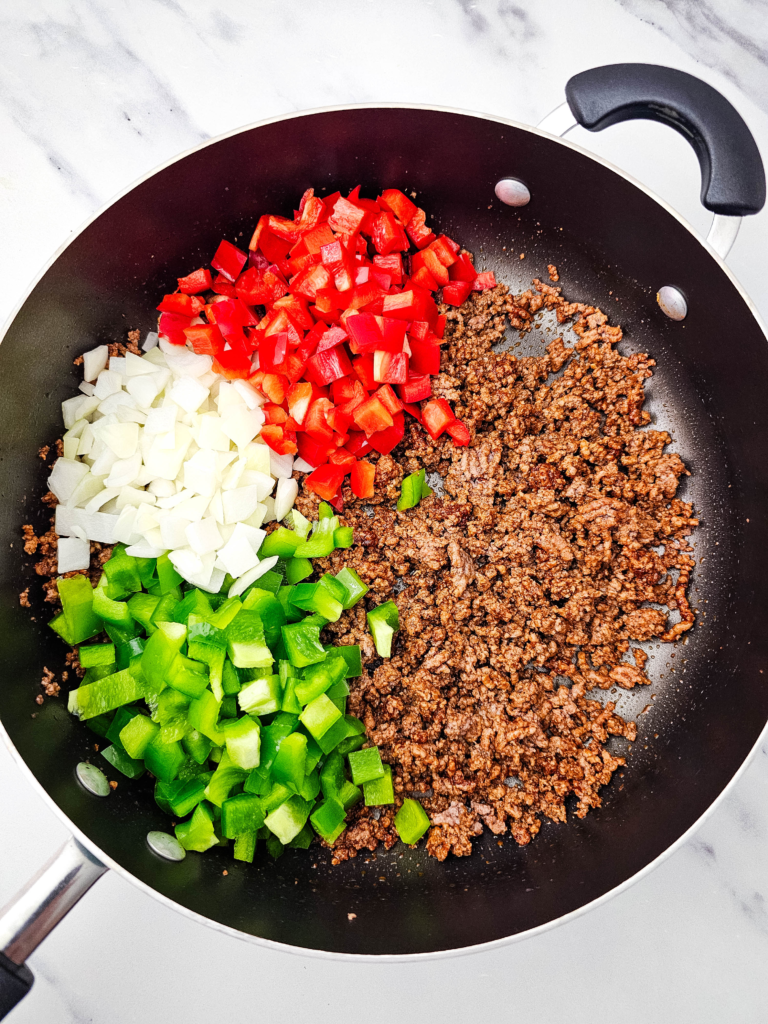 3. Brown the ground beef in a large skillet, breaking the meat apart as it cooks, until no longer pink. Drain any grease.