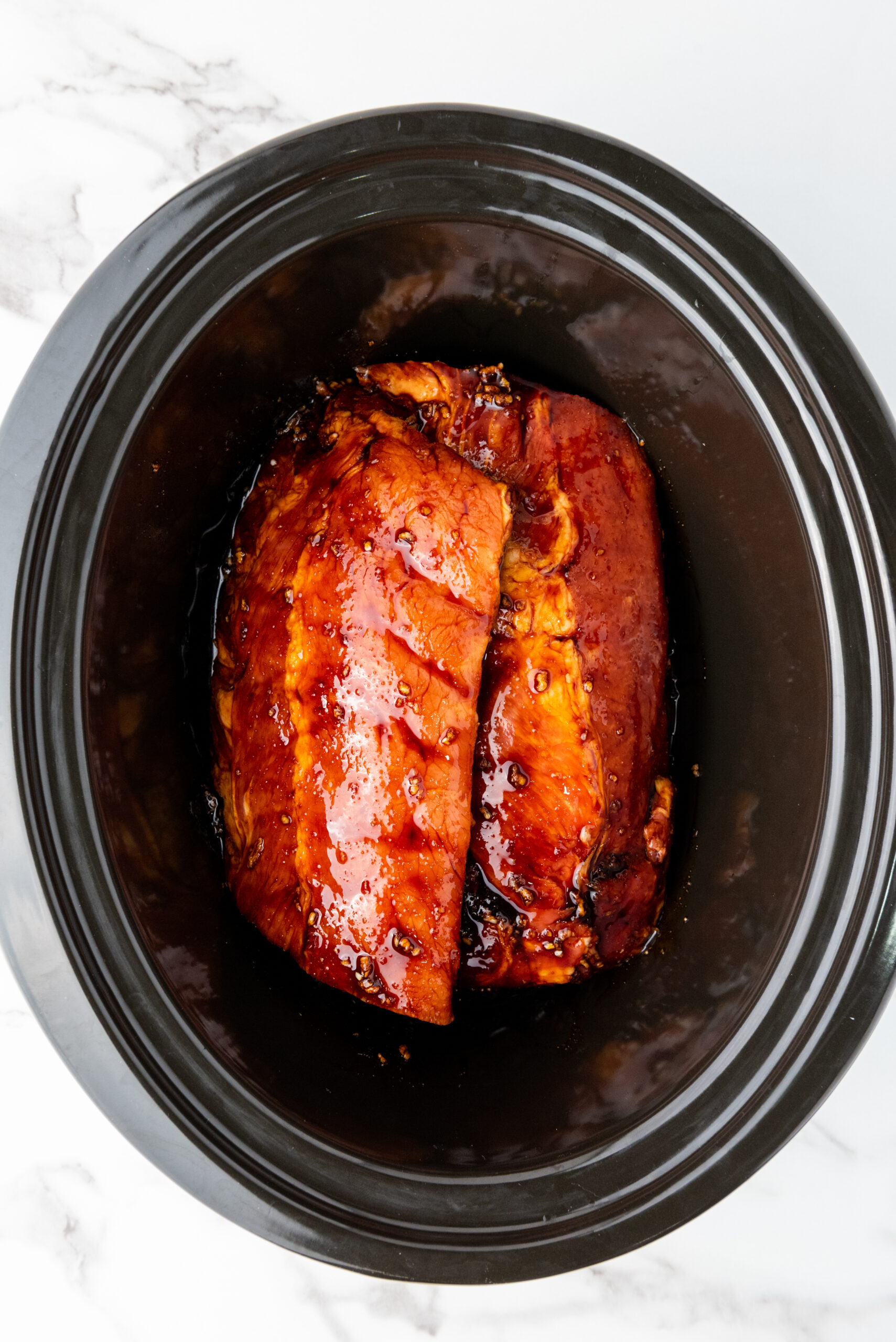 3. Cut the ribs in half and place them in the slow cooker. Cook for 7-8 hours on low or 4-5 hours on high.