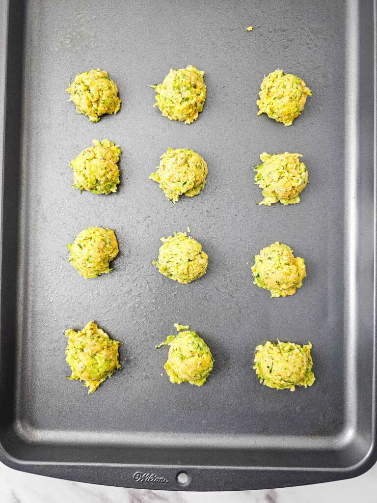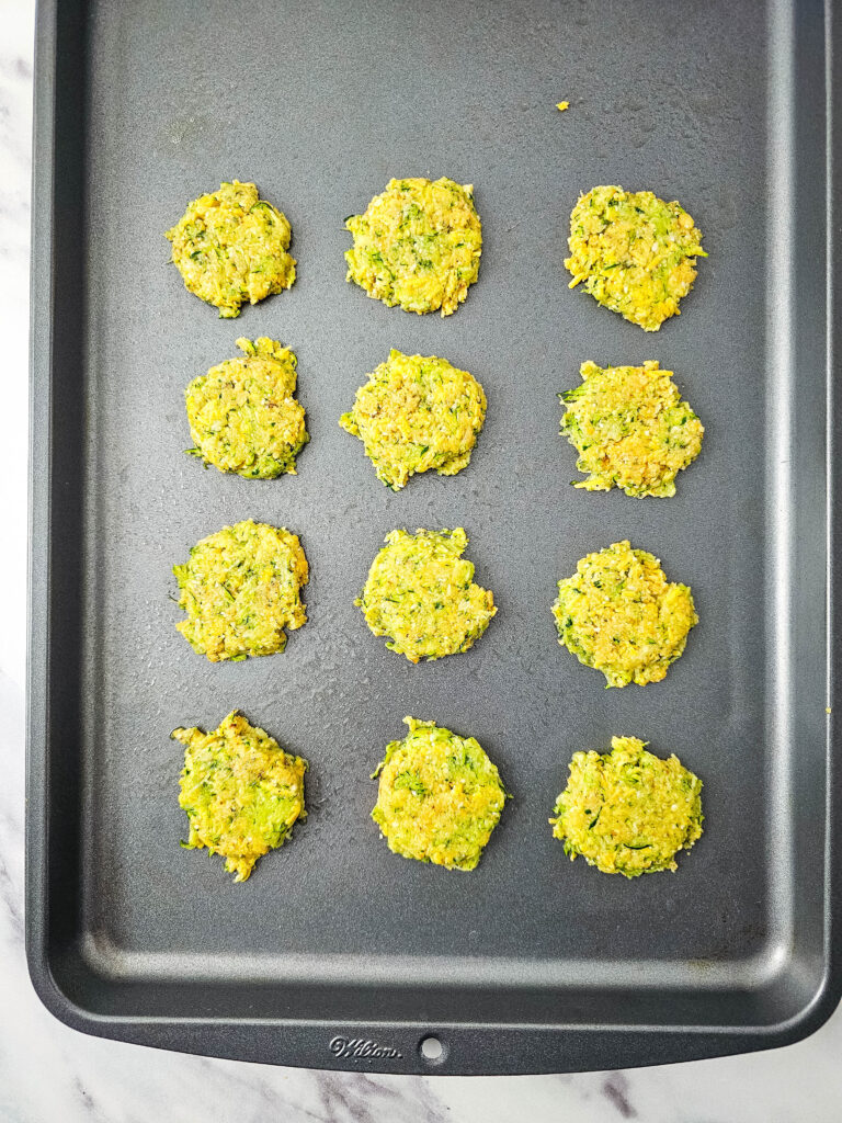 - Use a tablespoon to scoop the mixture, then place it on the baking sheet. Gently smash the zucchini scoops with the bottom of a glass or small bowl.
